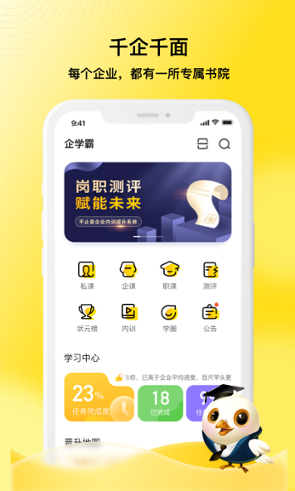 作为一站式企业员工职业化训练平台,提供全方位的在线学习,考试管理,人才测评,晋升地图,学圈交流、学习PK及企业内训等服务,赋能企业成长,助力员工提升。