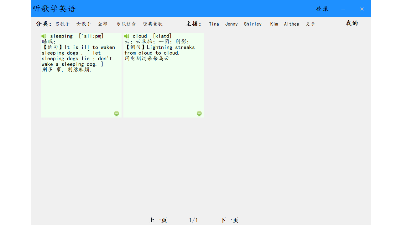 五、单词是英语学习的关键,对于不认识的单词,您可以在听歌曲的同时选词查看释义,可以听发音,并能添加到生词本。