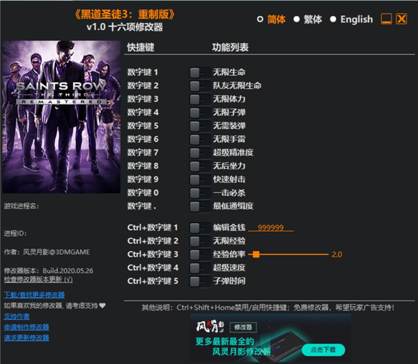 黑道圣徒3重制版修改器是由大佬风灵月影针对同名游戏黑道圣徒3重制版制作并推出的一款游戏修改器,这款修改器有着无限生命、无限体力、无限子弹、无限经验等多达十六项的游戏修改功能可以游戏的降低这款游戏的难度,此外为了让不清楚如何使用这款修改器的小伙伴们,小编还在下文带来里详细的使用教程,亲测可用,有需要这款修改器的小伙伴们欢迎前来本站免费下载使用。黑道圣徒3重制版英文名又称Saints Row: The Third Remastered,它是由Volition游戏公司制作、Deep Silve公司发行的一款第三人称角色扮演类游戏,同时本作也是黑道圣徒3,同时也是黑道圣徒3的重新制作的版本。该游戏可以看做是讲述前传的故事,在游戏中玩家将从一位小喽啰并最终成为一位犯罪组织中的精英成员的故事。