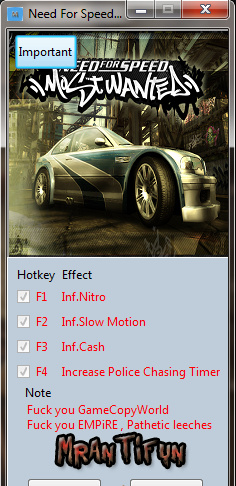 极品飞车9最高通缉四项修改器MrAntiFun版是用于极品飞车9的游戏辅助工具。通过使用它,我们能对游戏中的金钱数量,车辆的加速性能、警车追捕时间、子弹时间和氮气等进行修改。并且还能对车辆零件等级进行提高从而增强零件的功能。运行修改器后,通过在游戏中点击F1、F2、F3、F4来获得赏金、生涯车辆、所有零件和所有特殊零件等等。实现轻松体验游戏的乐趣,不用再麻烦于为道具解锁。