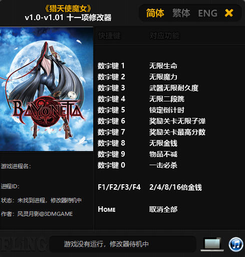 猎天使魔女修改器是一款专为《猎天使魔女》电脑游戏所打造的多功能修改器,一键实现开启奖励关卡最高分数、武器无限耐久度、无限魔力、一击必杀等功能,大大降低了游戏难度,让玩家拥有更加舒适的游戏体验!
