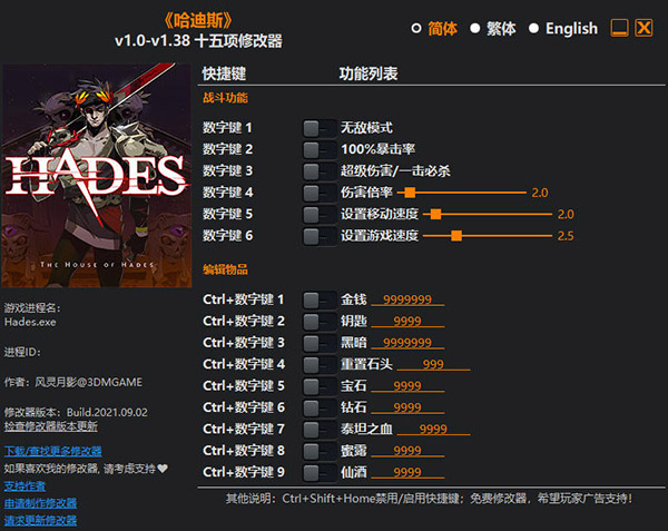 哈迪斯杀出地狱修改器是一款专为快节奏动作游戏《哈迪斯杀出地狱》所打造的多功能修改器,由风灵月影制作,功能强大,能够让玩家一键实现开启无敌模式、设置游戏速度、100%暴击率、超级伤害/一击必杀等功能,助你轻松畅玩游戏!