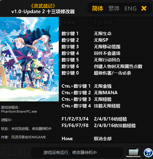 灵武战记修改器是专为《灵武战记》pc游戏而开发的一款免费辅助,由风灵月影制作,内置简体、繁体和英文三种语言,拥有13项修改作弊功能,包括无限生命、无限SP、无限行动回合、无限金钱、无限经验、一击必杀等等功能,可以大幅度的降低游戏难度,提高玩家的通关胜算,建议合理使用让游戏更刺激好玩!