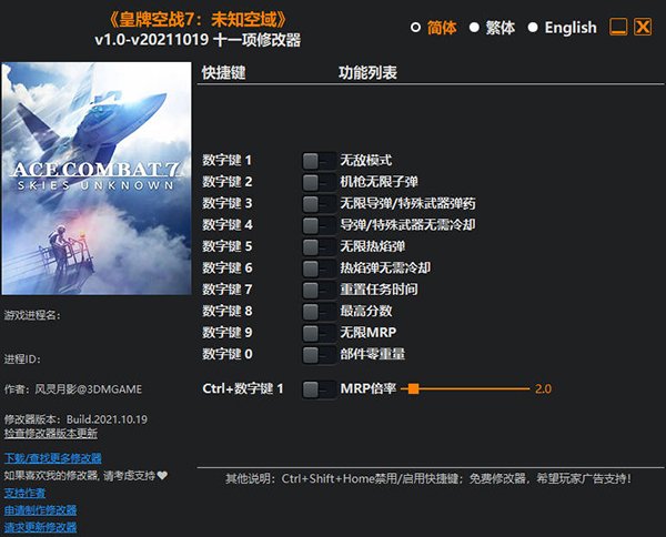 皇牌空战7未知空域修改器是一款专为空战游戏《皇牌空战7未知空域》所打造的多功能修改器,由风灵月影制作,提供无限导弹/特殊武器弹药、部件零重量、无限热焰弹、最高分数等修改功能,可带你感受不一样的游戏体验。并且,修改器简单易用,玩家只需启动游戏、开启修改器即可进行修改。