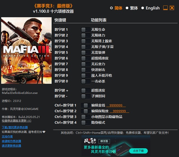 黑手党3最终版修改器是一款专为动作冒险游戏《黑手党3最终版》所打造的多功能修改器,修改器功能强大,能修改游戏内的敌人不能开枪、地图显示隐藏物品、一击必杀、隐身模式等功能,且修改器简单易用,玩家只需启动游戏、开启修改器即可进行修改。