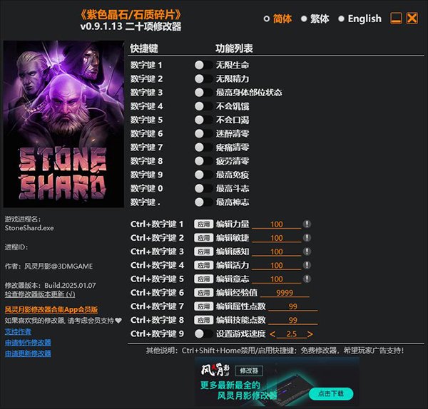石质碎片十八项修改器是一款专为像素回合制RPG游戏《石质碎片》所打造的多功能修改器,通过它玩家可修改游戏内的数值,如无限生命、让人物不会口渴、疲劳清零等等,且修改器简单易用,玩家只需启动游戏、开启修改器即可进行修改。