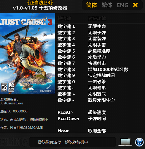 正当防卫3修改器是一款专为第三人称射击游戏《正当防卫3》所打造的多功能修改器,修改器具有无限生命、无限子弹、无限手雷、一击必杀、子弹时间等修改器功能,大大降低了游戏难度,让玩家拥有更加舒适的游戏体验,且修改器简单易用,玩家只需启动游戏、开启修改器即可进行修改。