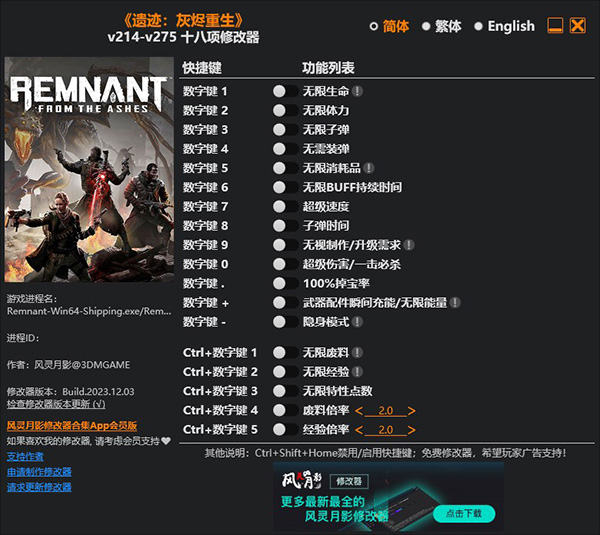 遗迹灰烬重生修改器是一款专为第三人称生存动作类游戏《遗迹灰烬重生》所打造的多功能修改器,由风灵月影制作。它能够让玩家一、二键实现开启无限BUFF持续时间、100%掉宝率、无限废料、无限特性点数等功能,大幅度降低游戏难度,助力你轻松游戏。且修改器简单易用,玩家只需启动游戏、开启修改器即可进行修改。