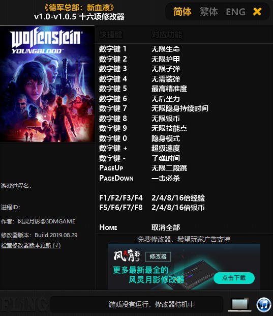 德军总部新血脉修改器风是一款专为第一人称射击游戏《德军总部:新血脉》所打造的多功能修改器,由风灵月影制作,具有无限生命、无需装弹、最高精准度、无限技能点、一击必杀、无限二段跳等修改功能功能,且修改器简单易用,玩家只需启动游戏、开启修改器即可进行修改,可大大降低玩家的游戏难度。