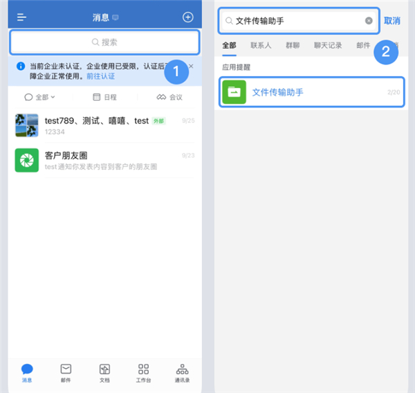 登录客户端会话界面,在搜索栏输入“文件传输助手”,点击进入即可。