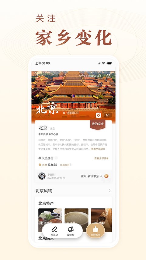 这里以城市为维度聚合了风物内容,你可以在这里看到你的家乡或者你向往的城市为它点赞助力,让更多的人看到它
