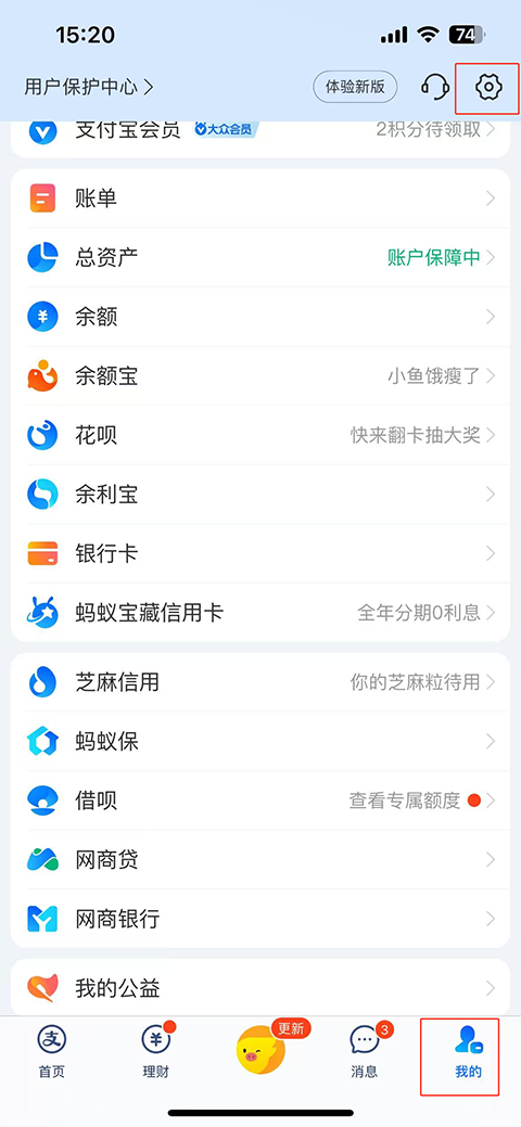 1、支付宝在个人中心页面,点击右上角设置图标。