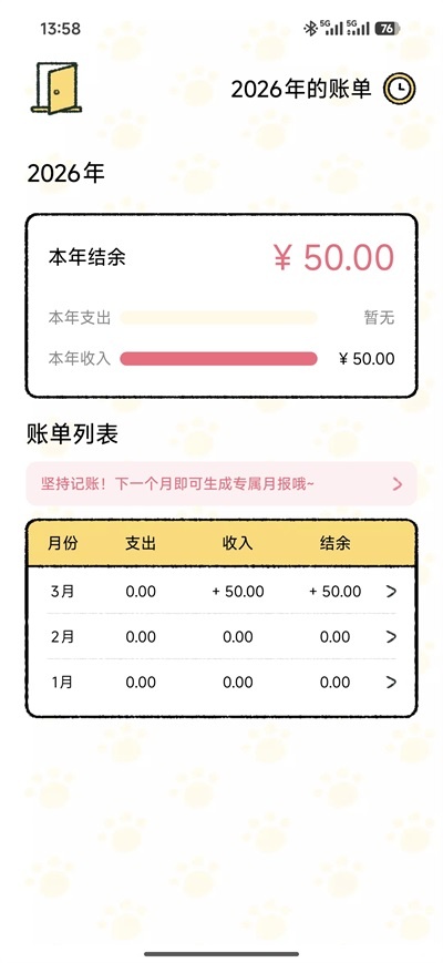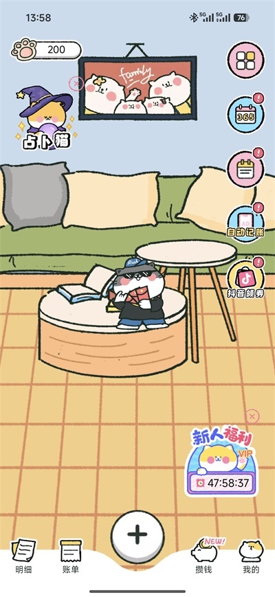 4、应用通过趣味化设计加入猫咪互动元素,记录消费可解锁不同猫咪角色,使记账过程更具参与感与娱乐体验。