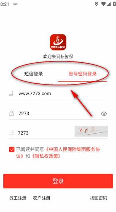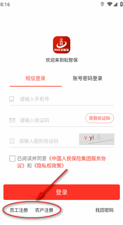 1、打开耘智保App后,员工与农户可在首页点击左下角对应的注册入口开始操作。