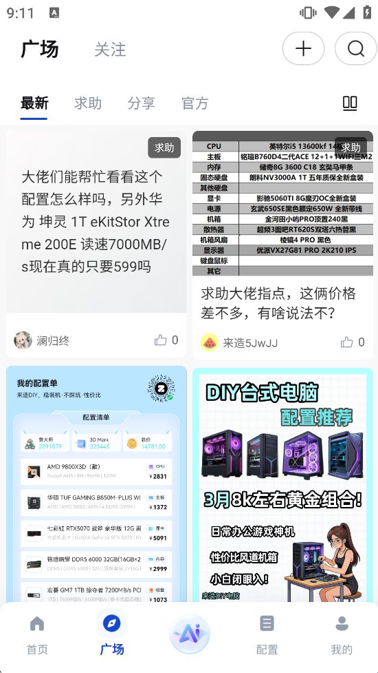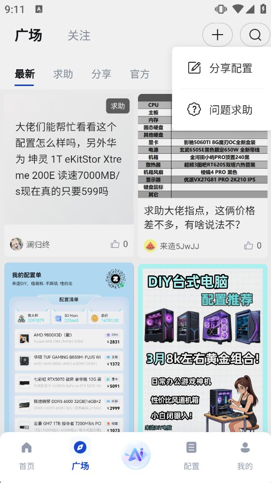 1、打开来造DIY软件后,在【广场】页面点击右上角的【+】号,进入发帖功能界面,准备发布内容。