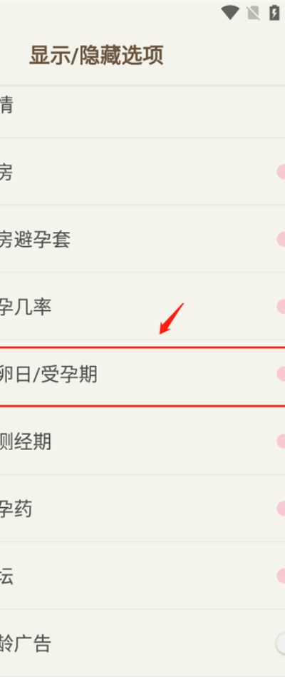 3、在功能列表中找到“排卵日/受孕期”开关选项,将对应开关关闭即可完成相关周期信息隐藏设置。
