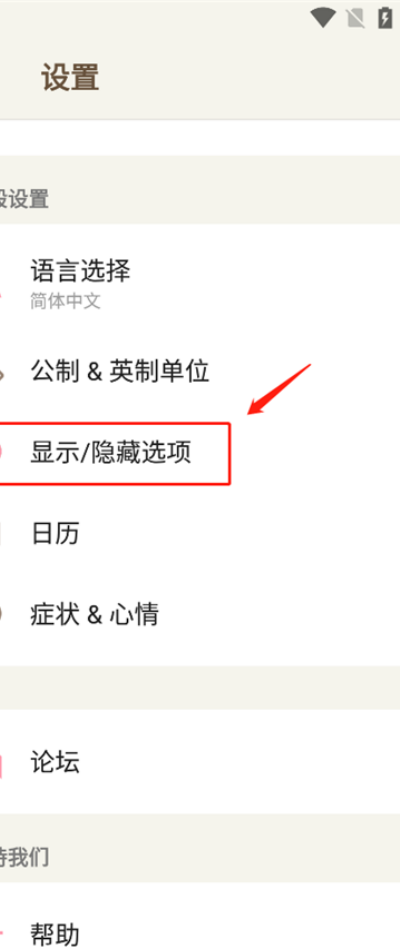 2、在设置页面中找到“显示/隐藏”功能选项并点击进入,查看各类周期信息显示控制开关。