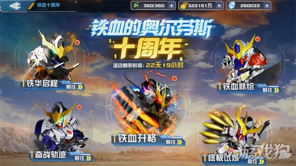 铁血十载,狼王烽烟再起!游戏内开启铁血十周年主题活动,满足前置条件,登录就能获得十周年特别升格典藏[敢达·巴巴托斯天狼座帝王形态(阿赖耶识限制解除)] ,持续参与活动还能免费将该机体升到6星。