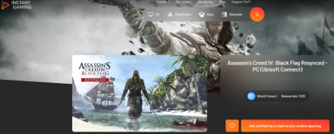 最近有一些线上零售商上架《刺客信条4:黑旗重制版》PC版商品页面,发行平台为Ubisoft Connect,发售时间为2026年,还有“预购开启邮件提醒”。