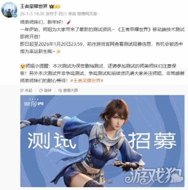 近日,《王者荣耀世界》官方宣布,移动端技术测试即将开启!2026年1月5日起至2026年1月20日23:59,前往游戏官网查看测试招募信息,有机会被选中,本次测试为保密删档测试。