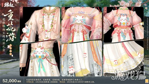 外观整体色调以柔粉、米白为主,辅以暖金、浅橙、柔红点缀,融入早春花饰元素与稚趣萌系纹样,面料轻盈垂顺,纹样精致细腻,既贴合盛唐雍容雅致的审美,又具有稚趣灵动的春日氛围。