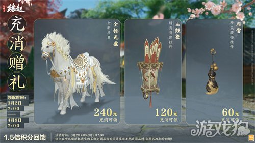 春启大唐,礼赠江湖!《剑网 3 缘起》春日充消赠礼活动3月2日7:00 暖心开启,领取时间持续至4月9日7:00,三档专属好礼等你解锁;60元充消即可领取腰部挂件「雁雪」,黑釉葫芦配鎏金飞雁,雅致灵动;120元充消可获背部挂件「玉鲤签」,锦鲤签筒藏吉运,氛围感拉满;240元充消更能解锁全新马具「金镫无虚」,素白鎏金形制华贵,纵马江湖尽显快意洒脱。更有限时福利加码,3月2日7:00至3月9日7:00 期间,侠士消费通宝立享150% 积分回馈,春日多重好礼已备,静待侠士前来解锁!