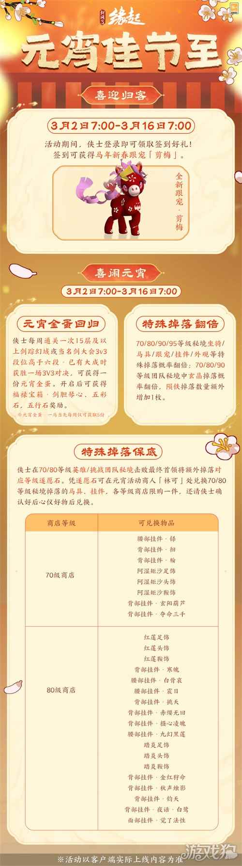 心仪好物不再错过!侠士通关70/80等级英雄 / 挑战团队秘境,击败最终首领将额外掉落对应等级遂愿石。凭遂愿石可前往元宵活动商人「林可」处,兑换对应等级秘境的稀有马具、挂件等奖励,70与80级商店内各物品限购一件。