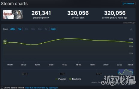 数据显示,《生化危机9:安魂曲》在Steam平台上的同时在线玩家数于发售首日达到32万560人的峰值。这一数据不仅使其成为目前该平台热度最高的游戏之一,也标志着《生化危机》系列在PC端的玩家活跃度达到历史最高点——相较于2023年发售的《生化危机4:重制版》(峰值16.8万),增幅接近一倍。
