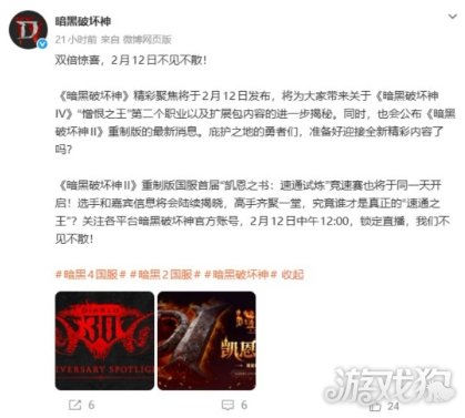 本次更新将在北京时间2月12日的《暗黑破坏神》30周年特别直播中正式揭晓。暴雪在公告中表示:“加入我们,深入了解《暗黑破坏神2:狱火重生》的未来计划。在步入《暗黑破坏神》三十周年之际,我们有许多内容希望与玩家分享。”