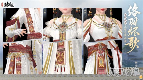 沙埋千城烬,弦歌万古扬。古城鸣沙主题外装礼盒“络羽烬歌”隆重亮相! 以鸣沙古城为魂,素雪裁衣为骨,赤金缀纹为韵,将大漠月华的清辉,簌簌落下的碎金尽数凝于一袭绸衫。以衣为笺,吟唱着一段被风沙掩埋的千年余歌。