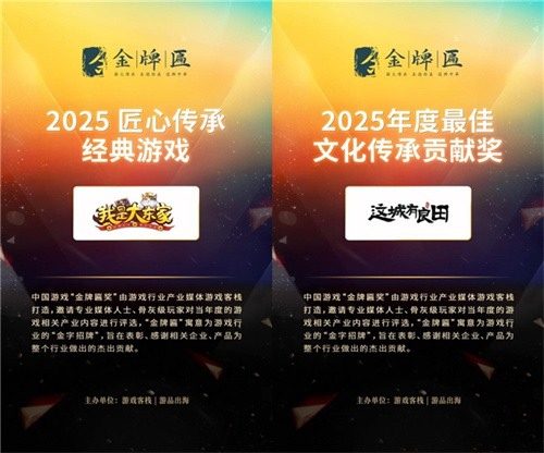 在关注产品品质与文化价值的评选中,由游戏客栈颁发的“金牌匾奖”将两项荣誉授予益世界:运营已四年的《我是大东家》获「2025匠心传承经典游戏」,展现了其通过持续内容迭代保持经典魅力的能力;而《这城有良田》则摘得 「2025年度最佳文化传承贡献奖」,表彰了其在游戏内深度融合传统文化、承担文化传播责任的卓越实践。