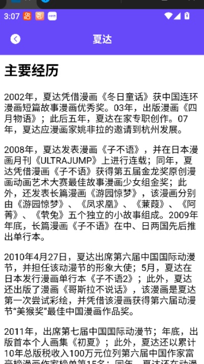 3、进入作者详情页面后,可以看到该作家的基础资料介绍,包括创作风格、相关背景以及漫画创作信息等内容,页面信息展示清晰。