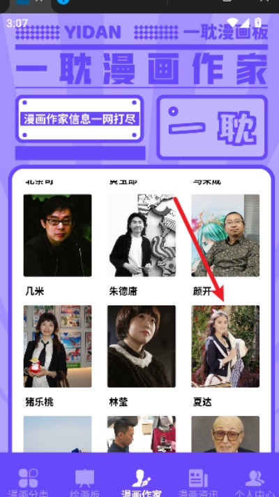 2、在漫画作家页面中浏览作者列表,根据兴趣点击想了解的作家头像或名称,进入该作者的个人信息与作品展示页面。
