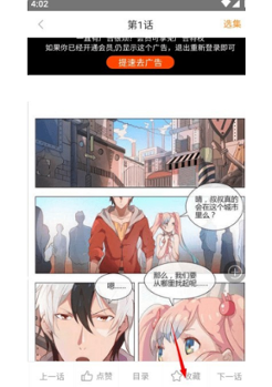 3、进入阅读界面后轻触屏幕,弹出功能菜单栏,点击“收藏”,即可将漫画保存至个人收藏列表。